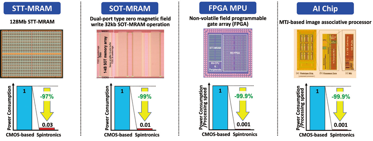 これらの技術を統合集積化することにより、STT-MRAM・SOT-MRAM及びスピントロニクス/CMOS Hybrid技術を用いたマイコンや画像認識プロセッサなどのAIアプリケーションプロセッサを設計し、300mmプロセスラインを用いて試作を行い、これまでその低消費電力性能を実証してきており、今後も本研究開発を通じさらなる技術革新を進めていきます。これにより、飛躍的な省エネルギーシステムを実現する不揮発ワーキングメモリや不揮発ロジックなどの実用化を促進し、カーボンニュートラル社会の実現に貢献します。